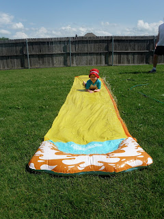 The water toys made their annual trip/release from the attic this month and the boys are ecstatic! We added a slip and slide to the fun this year, and it's a big hit with Drew especially. Noah loves the Elmo sprinkler and water table, and they both enjoy the kiddie pool too. It's the only way to survive a summer in Texas really!